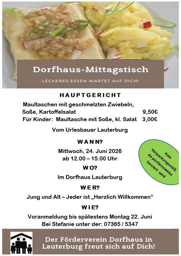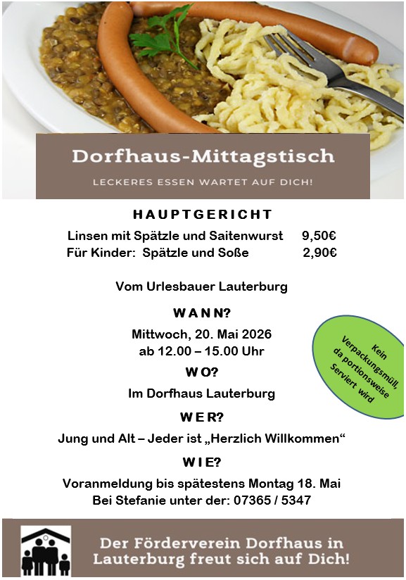 Mit zahlreichen Veranstaltungen, kulturellen Angeboten und neuen Ideen – vom Lichterfest über Vereinsabende bis hin zum beliebten gemeinsamen Mittagstisch – fördern wir das soziale Leben in Lauterburg und stärken den Zusammenhalt im Dorf.